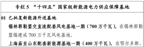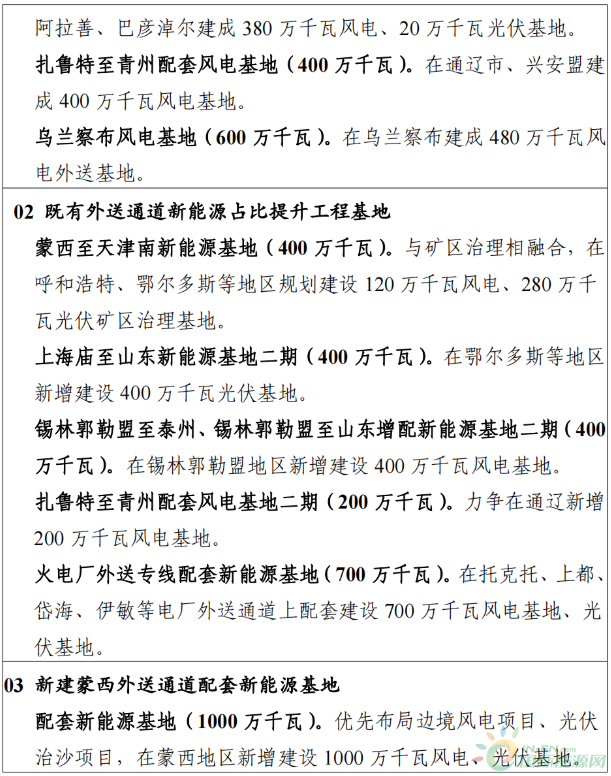 “十四五” 期間,規劃新增新能源外送基地 2900 萬千瓦,力爭累計投產 3900 萬千瓦。力爭2025 年前推動開工配套新能源基地 1000 萬千瓦。具體如下。