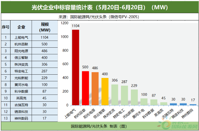 其中,上能電氣中標(biāo)1104MW,排名第一,杭州品聯(lián)500MW排名第二,陽光電源486MW列第三名。