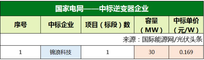 本統(tǒng)計周期內(nèi),國家電網(wǎng)有1個逆變器采購項目定標(biāo),定標(biāo)容量30MW,錦浪科技中標(biāo)。