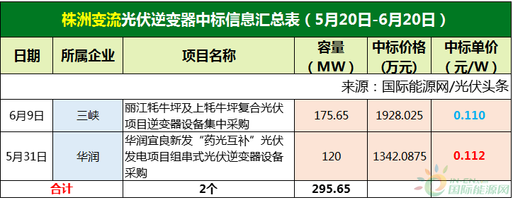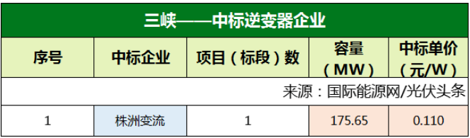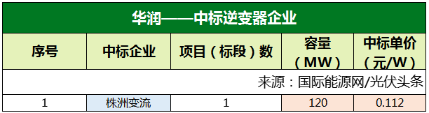三峽集團(tuán)、華潤兩大央企各自定標(biāo)1個逆變器采購項目,容量分別為175.65MW、120MW。株洲變流技術(shù)成為最大贏家,全攬這兩個項目。