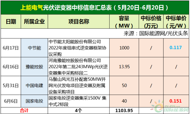 6月17日,中節(jié)能公示了1GW逆變器2022年度組串式逆變器框架協(xié)議采購候選人名單,上能電氣成為最大的贏家,獨享1GW采購份額。