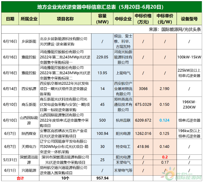 國際能源網(wǎng)/光伏頭條(PV-2005)梳理發(fā)現(xiàn),5月下旬以來,山西國際能源集團(tuán)、陜西煤業(yè)、豫能控股等地方企業(yè)10個項目定標(biāo),合計容量957.94MW。與上個統(tǒng)計周期相比,定標(biāo)容量大為減少。