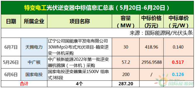 5月下旬以來,特變電工中標(biāo)國家電投、中廣核、天擁電力等企業(yè)的3個項目(標(biāo)段),合計容量287.2MW。