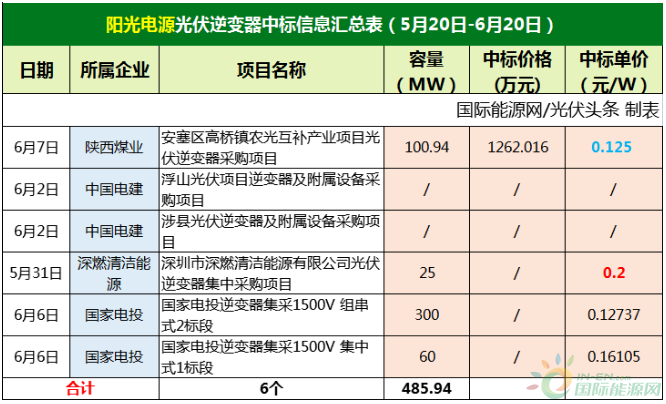5月下旬以來,陽光電源中標(biāo)中國電建、國家電投、陜西煤業(yè)、深燃清潔能源等企業(yè)6個項目(標(biāo)段),確定中標(biāo)容量485.94MW。