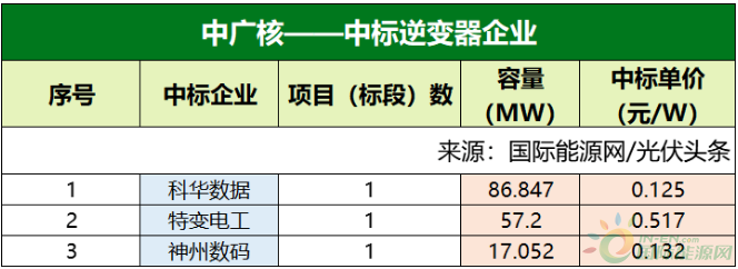 中廣核有3個項目定標(biāo),合計容量161MW,科華數(shù)據(jù)、特變電工、神州數(shù)碼三家企業(yè)中標(biāo),具體情況如下: