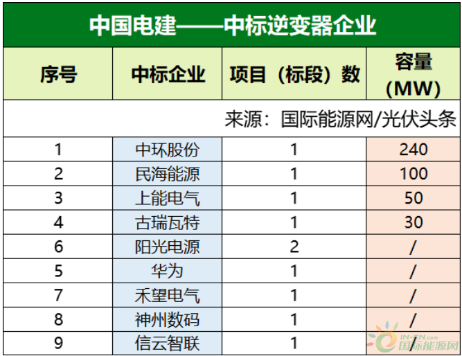 中國電建10個項目定標(biāo),可以確定的招標(biāo)容量為420MW,其中,最大的一筆訂單——尚義二期240W光伏項目逆變器及附屬設(shè)備采購項目,由中環(huán)股份控股的內(nèi)蒙古環(huán)興電力建設(shè)工程有限公司中標(biāo)。