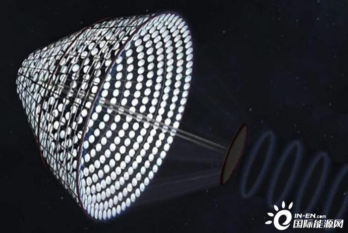 太空太陽能:一個碟形太陽能收集陣列在軌道上,將能量傳送到地球。