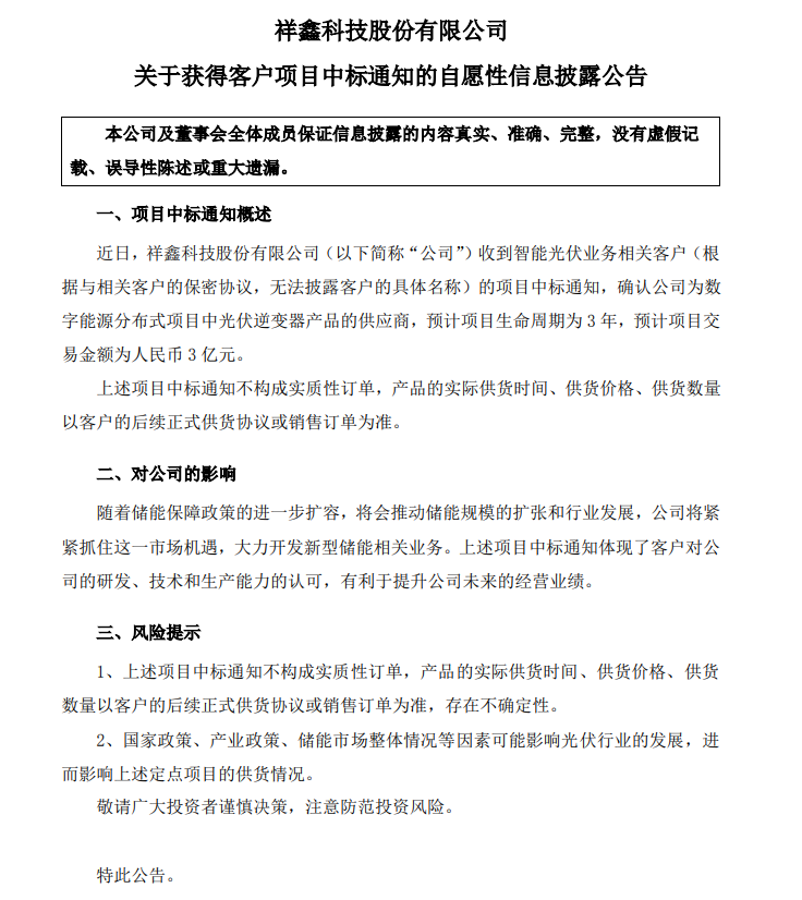 國際能源網/光伏頭條獲悉,6月1日祥鑫科技發布公告,近日,公司收到智能光伏業務相關客戶(根據與相關客戶的保密協議,無法披露客戶的具體名稱)的項目中標通知,確認公司為數字能源分布式項目中光伏逆變器產品的供應商,預計項目生命周期為3年,預計項目交易金額為人民幣3億元。