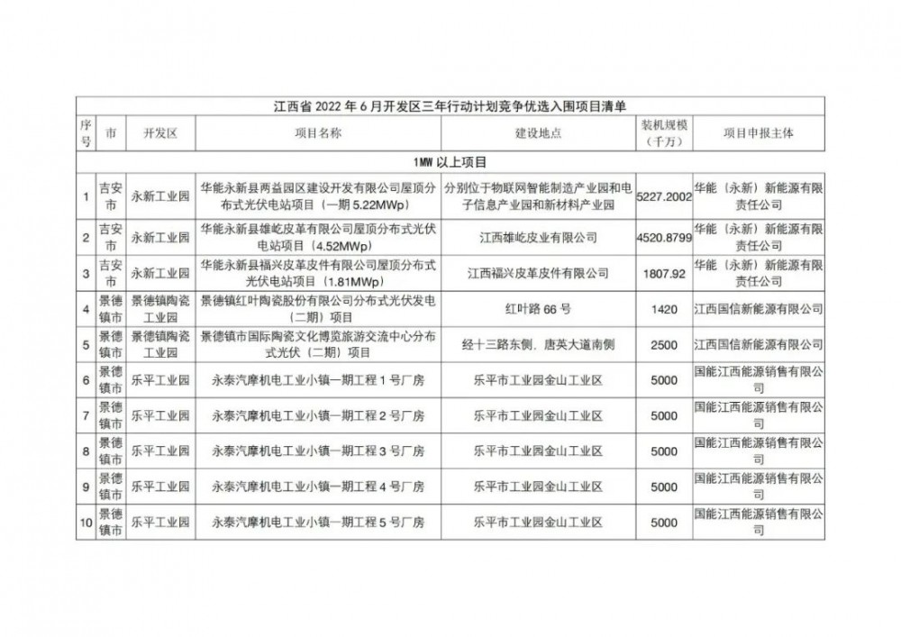 202MW!江西公布2022年6月開發區三年行動計劃競爭優選入圍項目清單