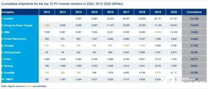 (2012-2020年全球前十逆變器供應商的出貨數(shù)據(jù)統(tǒng)計。來源:伍德麥肯茲)