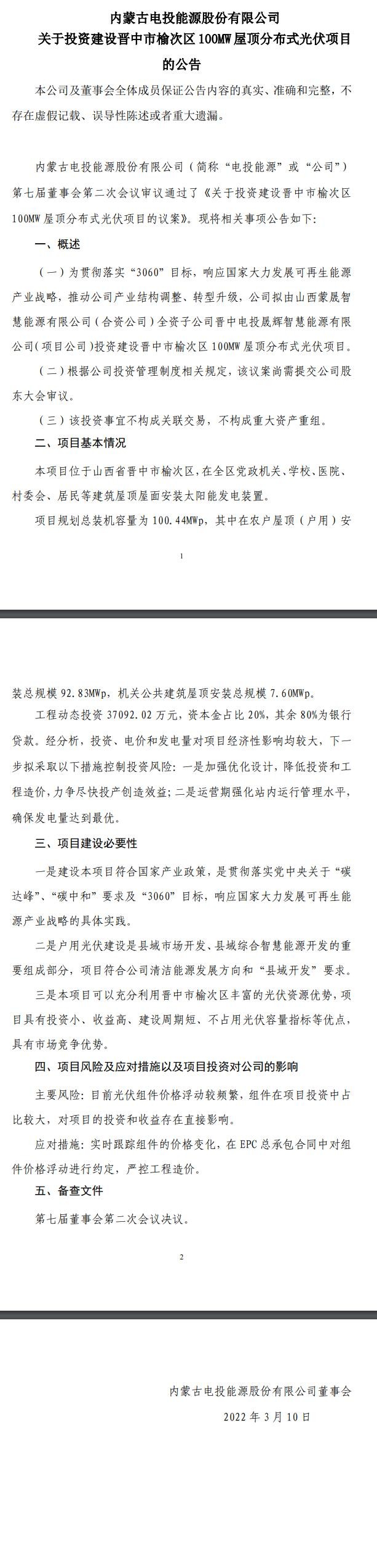【國際能源網 訊】3月11日,內蒙古電投能源股份有限公司發布《關于投資建設晉中市榆次區100MW屋頂分布式光伏項目的公告》,披露該公司擬由山西蒙晟智慧能源有限公司(合資公司)全資子公司晉中電投晟輝智慧能源有限公司(項目公司)投資建設晉中市榆次區100MW屋頂分布式光伏項目。