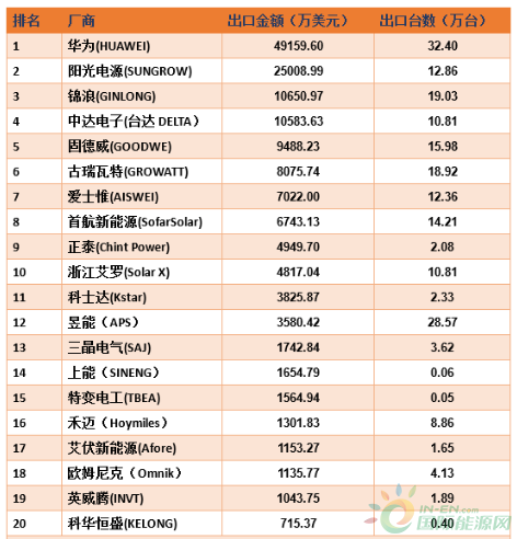 逆變器出口TOP 20:華為、陽光、錦浪領銜,固德威、古瑞瓦特、三晶等上榜
