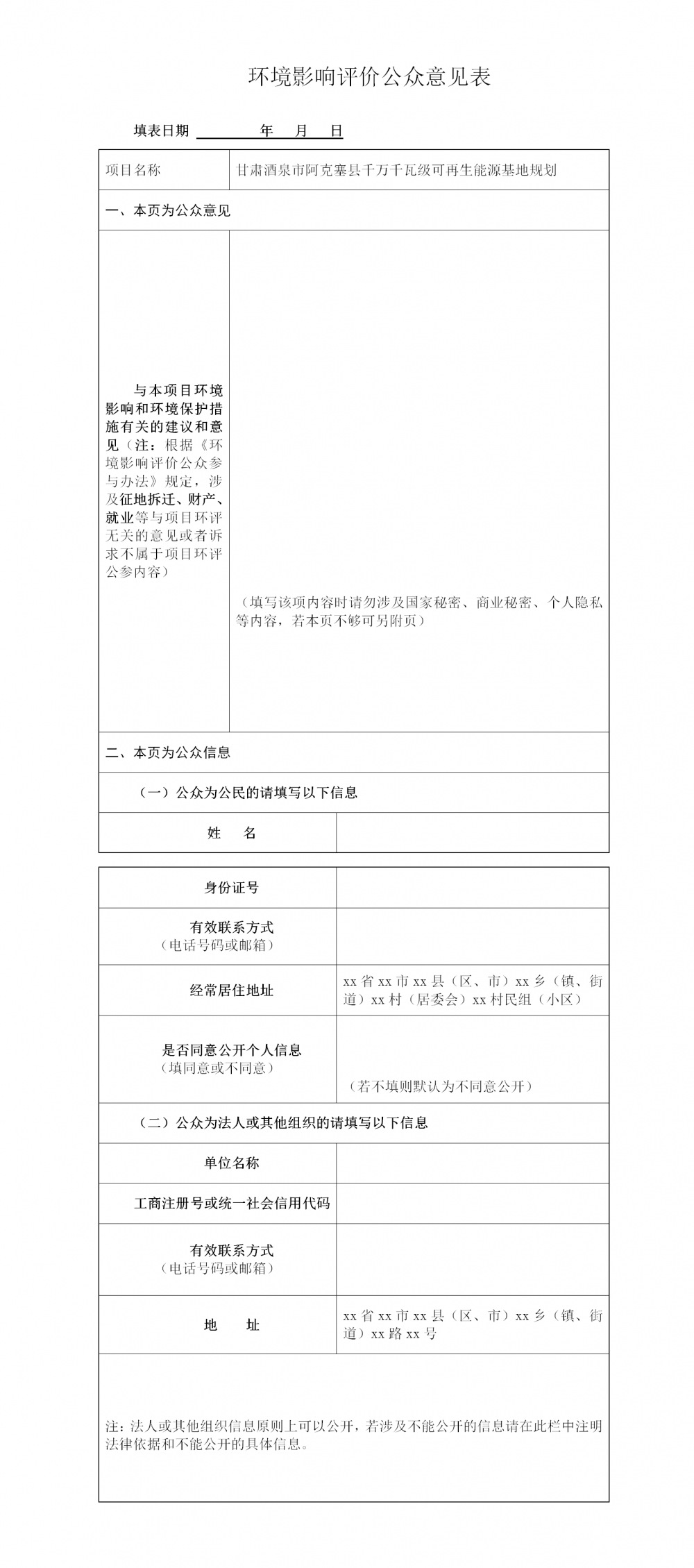 甘肅酒泉市阿克塞縣千萬(wàn)千瓦級(jí)可再生能源基地規(guī)劃環(huán)境影響評(píng)價(jià)征求公眾意見(jiàn)第一次公示