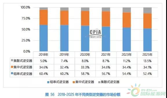 光伏逆變器按照適用場所分為集中式逆變器、集散式逆變器、組串式逆變器以及微型逆變器。集中式和組串式逆變器我相信大家都不很清楚其中的區別,今天我們主要講一講集散式光伏逆變器,集散式光伏發電解決方案是指:分散MPPT尋優,集中并網發電形式,通過前置多個MPPT控制優化器,實現多路MPPT尋優功能,匯流后采用集中式逆變器逆變的新型、高效光伏發電解決方案。 此方案的推出,讓電站投資商們在集中式和組串式之外,還有第三種選擇。目前,國內擁有集散式解決方案并投入項目的企業還不多,無錫上能和深圳禾望稱得上是此類技術的代表,上能力推的集散式光伏發電解決方案比集中式逆變方案發電收益更高,比組串式逆變方案成本更低,可使系統發電量提升2%~5%。作為傳統逆變器的重大創新,集散式方案在大同領跑者示范基地項目中獲得了同煤、中節能、華電、三峽新能源、正泰等業主的一致認可,得到了規?;瘧?。集散式方案直流傳輸電壓提高至800Vdc,交流輸出電壓提高至520Vac,交直流電纜成本大大降低;可實現2MW大容量子陣組網,進一步降低系統成本。 集散式逆變器,實現組串級MPPT,復雜山地電站發電量更高;提升直流和交流傳輸電壓,遠距離傳輸減少線損;容配比配置靈活,進一步降低系統成本;單機容量1MW,可根據地形靈活配置子陣容量;集中式并網,電網適應性更好,憑借發電量和系統成本優勢,將成為山地領跑者電站中的主流。 隨著分布式光伏市場的快速增大及集中式光伏電站中組串式逆變器占比的增高,組串式逆變器在 2018 年的市場占比達到了 60.4%。集散式光伏逆變器相比集中式逆變器提升 MPPT 控制效果,且相比組串式逆變解決方案擁有較低的建造成本。因此,市場份額呈現出逐年上升的趨勢。2018-2025 年不同類型逆變器的市場份額如下圖所示。