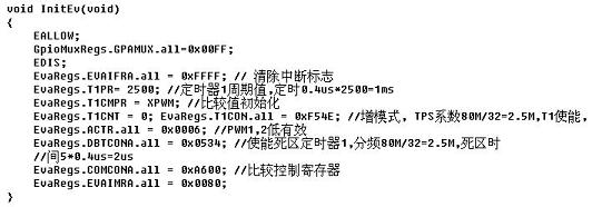 利用F28335內(nèi)部的事件管理器模塊的3個(gè)全比較單元、通用定時(shí)器1、死區(qū)發(fā)生單元及輸出邏輯可以很方便地生成三相六路SPWM波形。實(shí)際應(yīng)用時(shí)在程序的初始化部分建立一個(gè)正弦表,設(shè)置通用定時(shí)器的計(jì)數(shù)方式為連續(xù)增計(jì)數(shù)方式,在中斷程序中調(diào)用表中的值即可產(chǎn)生相應(yīng)的按正弦規(guī)律變化的SPWM波。SPWM波的頻率由定時(shí)時(shí)間與正弦表的點(diǎn)數(shù)決定。
