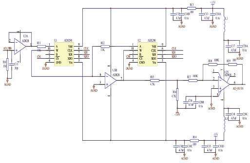 電壓檢測(cè)是完成閉環(huán)控制的重要環(huán)節(jié),為了精確的測(cè)量線電壓,通過(guò)TMS320F28335的SPI總線及GPIO口控制對(duì)輸入的線電壓進(jìn)行衰減/放大的比例以滿足A/D模塊對(duì)輸入信號(hào)電平(0-3V)的要求。電壓檢測(cè)模塊采用256抽頭的數(shù)字電位器AD5290和高速運(yùn)算放大器AD8202組成程控信號(hào)放大/衰減器,每個(gè)輸入通道的輸入特性為1MΩ輸入阻抗+30pF。電壓檢測(cè)模塊電路原理圖如圖4所示。