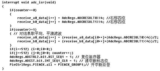 主要完成線電流采樣和線電壓采樣。為確保電壓與電流信號(hào)間沒(méi)有相對(duì)相移,本部分利用TMS320F28335片上ADC的同步采樣方式。為提高采樣精度,在A/D中斷子程序中采用均值濾波的方法。 對(duì)A相電壓和電流A/D的同步采樣部分代碼如下: