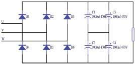 采用二極管不可控整流電路以提高網(wǎng)側(cè)電壓功率因數(shù),整流所得直流電壓用大電容穩(wěn)壓為逆變器提供直流電壓,該電路由6只整流二極管和吸收負(fù)載感性無(wú)功的直流穩(wěn)壓電容組成。整流電路原理圖如圖2所示。