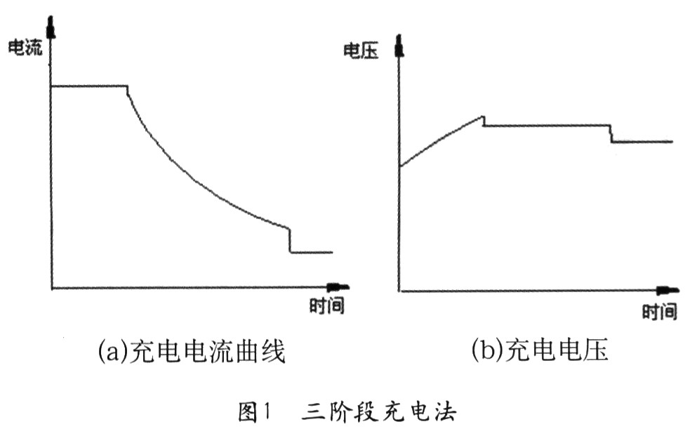 三階段充電法是兩階段等流充電法和恒定等壓充電法相結合的方式。充電開始和結束時采用恒定電流,中間階段為恒定電壓充電。蓄電池在充電初期用較大的電流,經過一段時間改為恒定電壓充電,當電流衰減到預定值時,由第二階段轉到第三階段。采用三階段充電法的優點是:避免了恒定電壓充電法開始充電電流過大,而后期電流又過小的情況,比二階段等流充電在中間階段更接近充電電流接受率曲線。這種充電法減少了充電出氣量,充電又徹底,延長了蓄電池使用壽命。三階段充電法充電電流和充電電壓變化曲線如圖1所示。