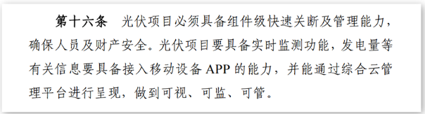 “項目建設管理”章節中的第16條明確要求:光伏項目必須具備組件級快速關斷及管理能力, 確保人員及財產安全。