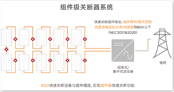組件級關斷器是一種可實現組件級別的快速關斷的裝置,在危急情況下,可以遠程或者手動快速關斷每一塊光伏組件之間的連接,斷開后系統電壓等于組件開路電壓,消除“電擊風險”。