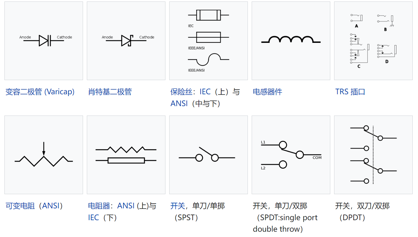 在電路圖符號的標準也有數個,依地區而異,有些微差異。目前的國際標準是IEC 60617。